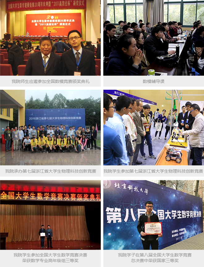 国际大学生数学建模竞赛、全国大学生数学建模竞赛、全国大学生数学竞赛、浙江省大学生高等数学竞赛、浙江省大学生物理创新(科技)竞赛、浙江省大学生物理创新(理论)竞赛和“泰迪杯”数据挖掘挑战赛,共取得国际一等奖2项、二等奖7项、三等奖5项,全国一等奖80项、二等奖122项、三等奖186项、优胜奖110项,浙江省一等奖255项、二等奖591项、三等奖1166项。