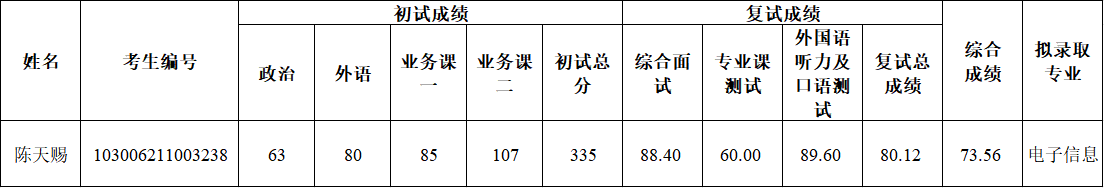 因BBIN 统筹分配,电子信息专业增加一个名额。经考生初试、复试等各个环节,BBIN 招生工作领导小组确认,现对拟录取的考生进行公示(详见下表),公示时间为2026年4月13日至2026年4月20日(七日),如有疑义,请以书面的形式反映,反映问题要实事求是,署本人真实姓名。