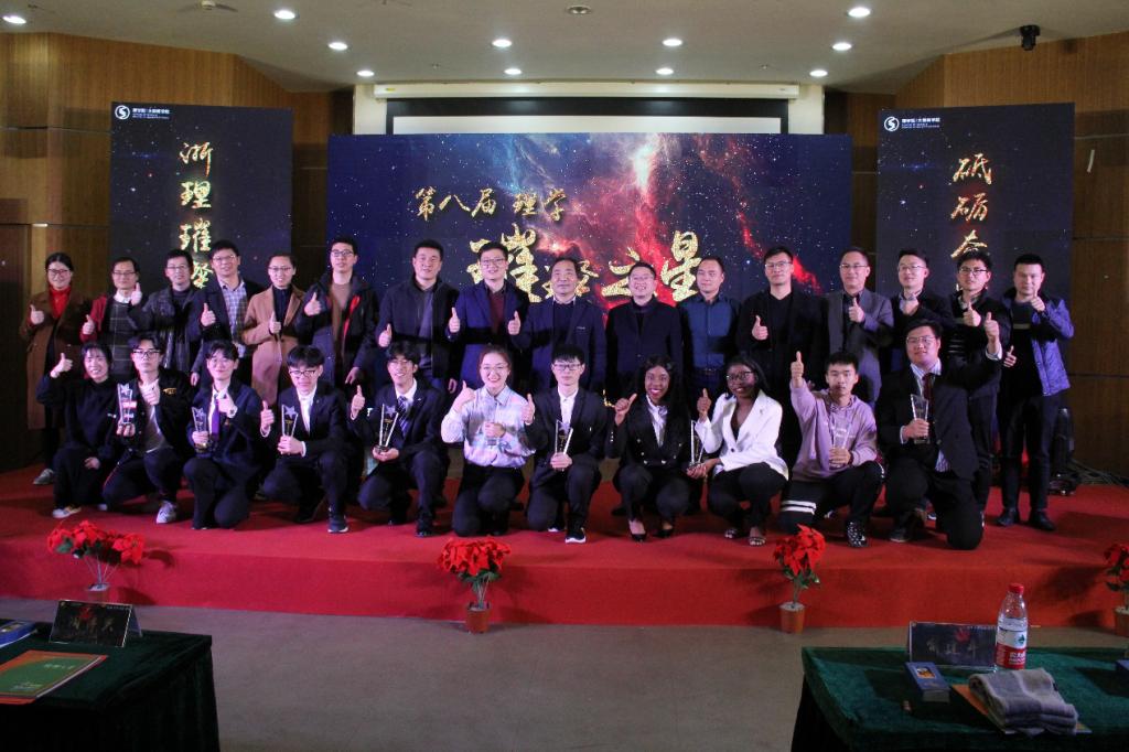 共有10名学生获得本届理学·璀璨之星,葛龙威老师,俞建平老师以及章迪平老师璀璨之星们颁发了奖杯与证书,并一同合影留念。
