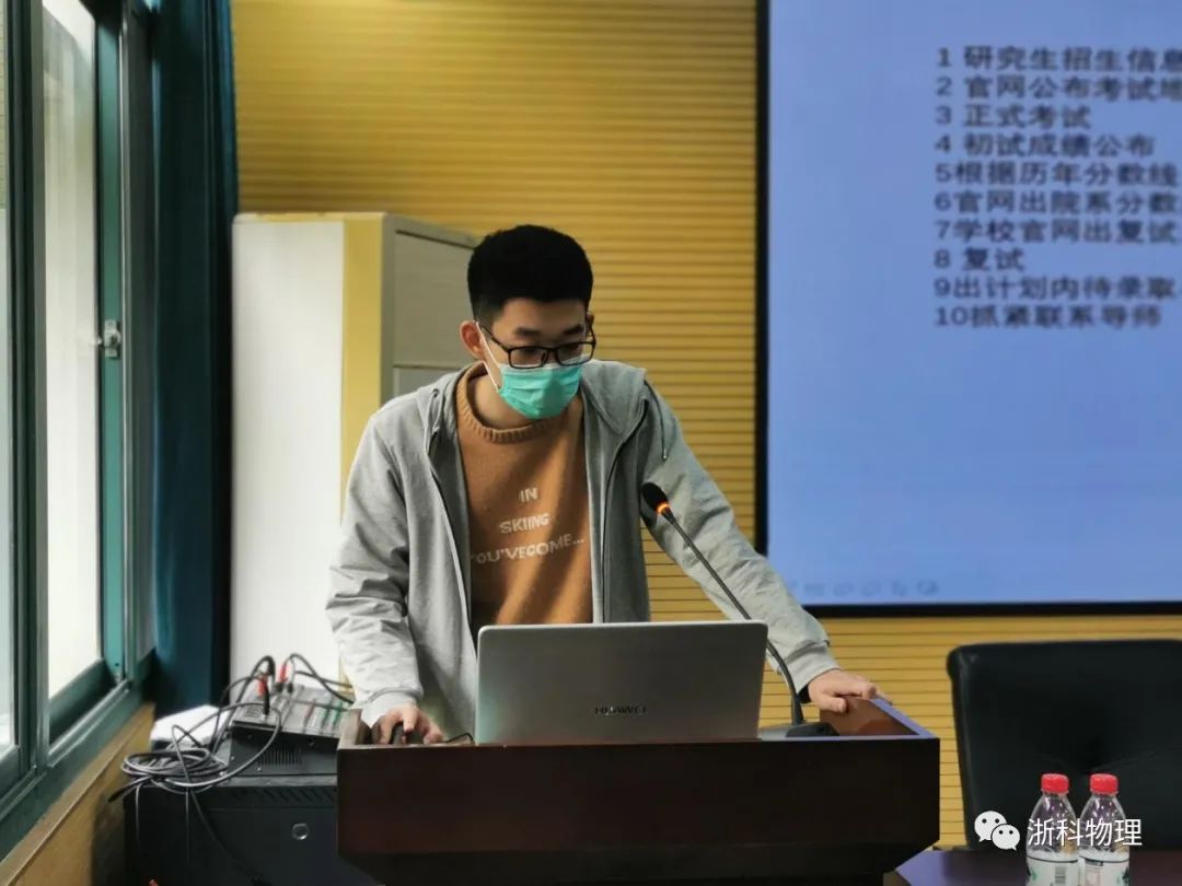 本次活动邀请了18级上岸华科物理系的黄勇涵、上岸华科光学工程蒋立治、上岸宁波大学物理系杨永磊、上岸南京邮电大学物理系的韩俊辉来做了考研经验分享。本次活动采取了线下线上相结合的方式,在“浙科物理”钉钉群中进行了同步直播。孙婷婷老师、黄喆老师和19级、20级的部分同学一起参与了线下交流。