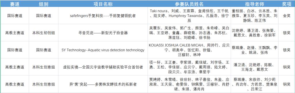 项目《safefingers手复科技---手部复健领航者》《寻音觅迹——新型光子拾音器》等5项作品荣获大赛金奖1项、银奖2项、铜奖2项。获奖名单:
