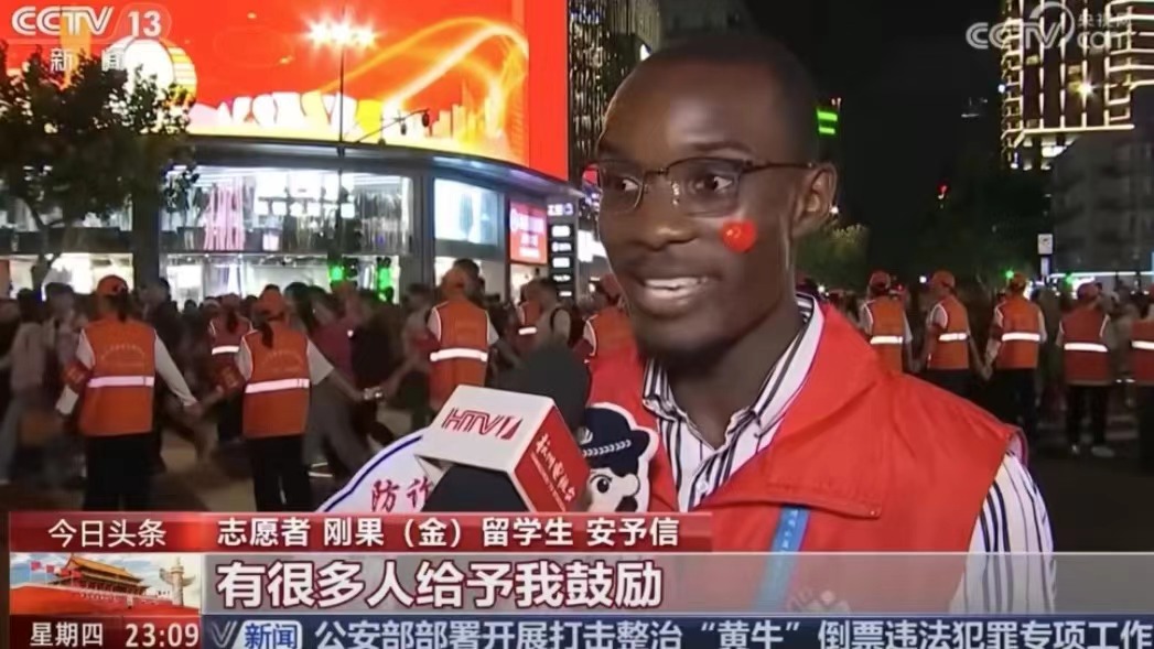 此次国庆志愿行动中,还有国际友人在服务队伍中全心投入的身影。来自刚果(金)留学生的安予信(Amini),现就读于BBIN