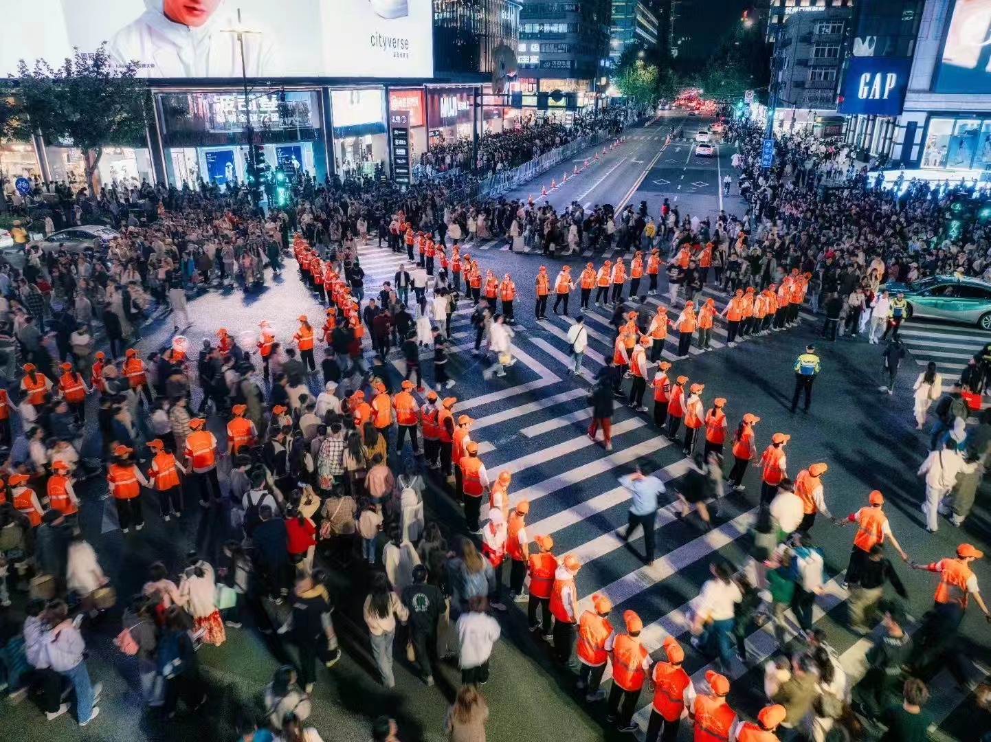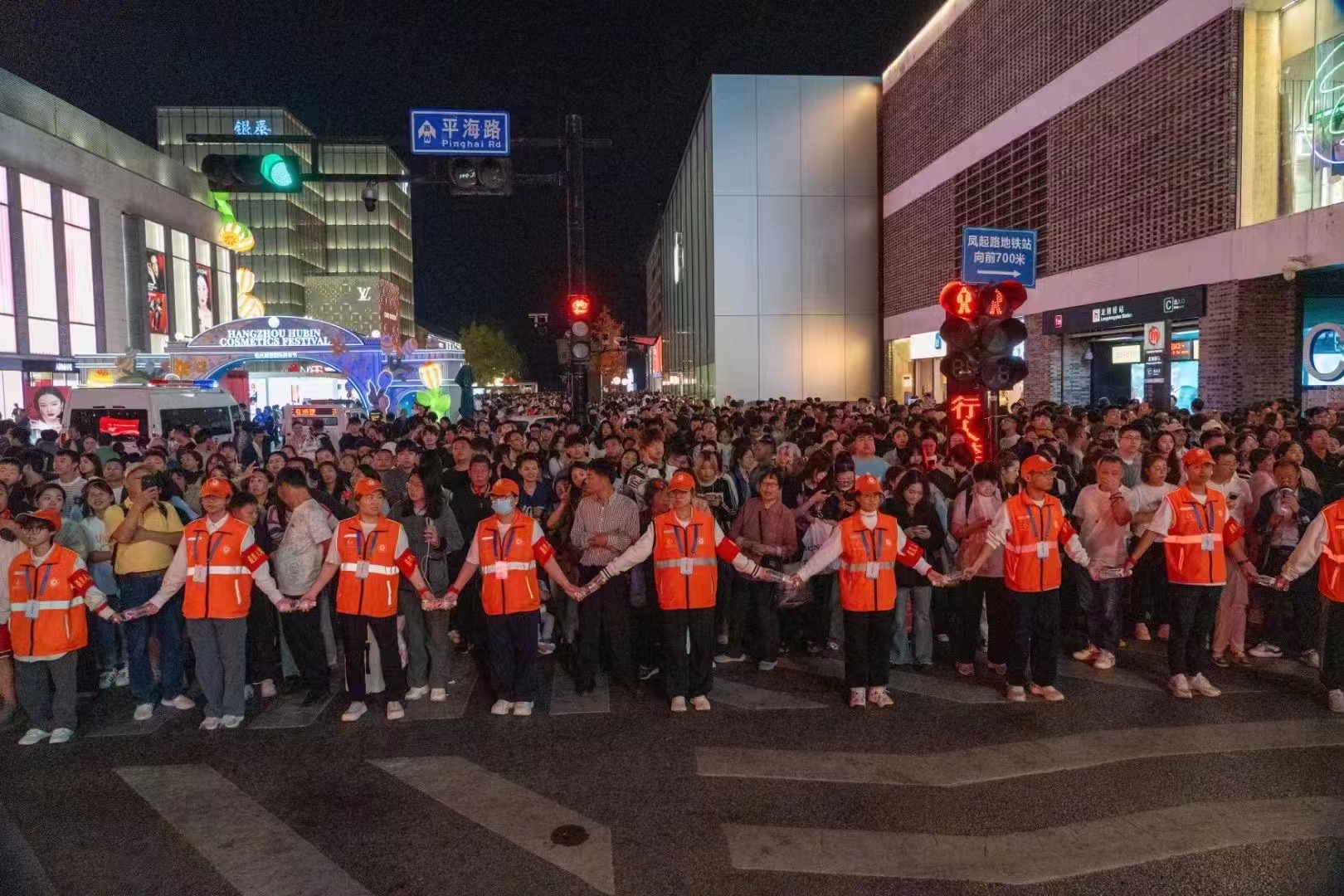 杭州作为旅游热门目的地,在国庆假期迎来汹涌的人潮。每当路口绿灯亮起,“人墙”自动裂开,身后的人潮蜂拥而出,涌向马路的另一边;红灯亮起,“人墙”再次合拢。在这样的循环往复中,“人墙”随着红绿灯开开合合,保证行人和车辆都能遵守交通秩序,大大缓解了路口的拥堵程度。此外,志愿者们还在胜利剧院公交站和龙翔桥公交站等点位帮助游客指引方向、解答各类问题等便民服务,在湖滨步行街宣传反诈和打击乱拉客等野导行为,在湖滨红十字爱馨驿站开展红十字急救等一系列志愿服务。