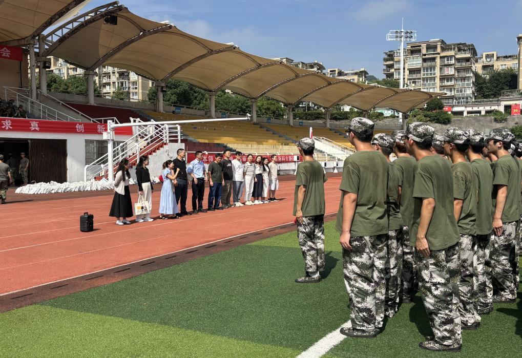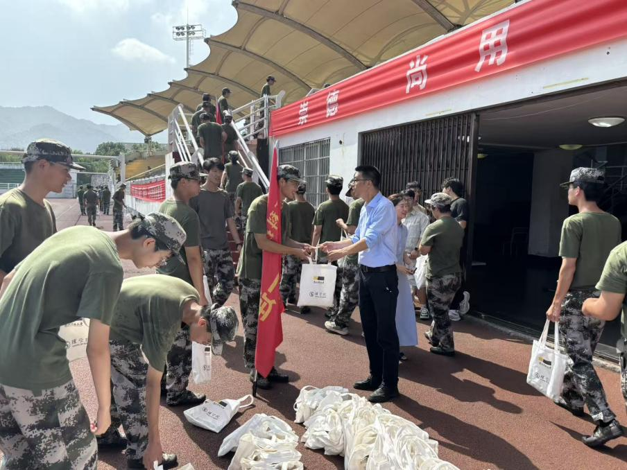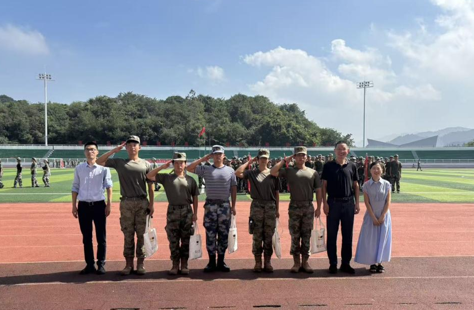 院长骆钧炎、党委书记丁炳泉率党政领导班子全体成员及新生班主任、辅导员赴军训田径场,亲切慰问正在参加军事训练的2025级新生及承训教官。