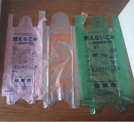 佐贺市一般星期二和星期五收粉色袋子的可燃垃圾,星期三收灰色袋和绿色袋的垃圾。
