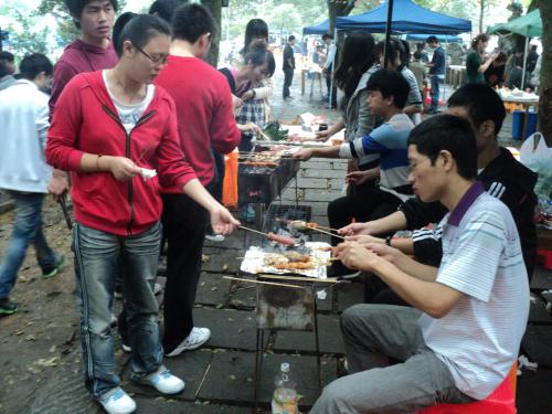 到达烧烤地点我们马上开始行动,男生们整理桌子和烤炉,女生们洗菜,分工明确,动作特快,可能是大家饿了吧,走了那么长时间的路,对于我这些整天泡寝室或图书馆的学生,也算是一个马拉松了。烧烤开始了,里脊肉、鸡翅、贡丸、玉米、紫薯,气中弥漫着食物的诱惑,这时,一个个饥肠辘辘的我们,谁还能抵挡得住,都开始大吃特吃,举杯畅饮。这才是一个集体。经过大家的一番“扫荡”后,颗粒无剩,一片狼藉……此时,活跃分子喊了“三国杀、斗地主搞起来了“,最后的棋牌大战更是将活动推向高潮,斗地主,三国杀……欢笑声此起彼伏