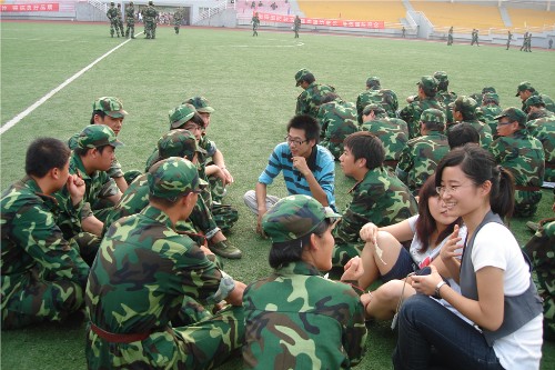 处在新生围的群中,我们大家都是喜气洋洋,其乐融融啊。大家看到我们都是那么的惊讶,好像他们不是在军训,而是在和我们做新老生交流会一样。