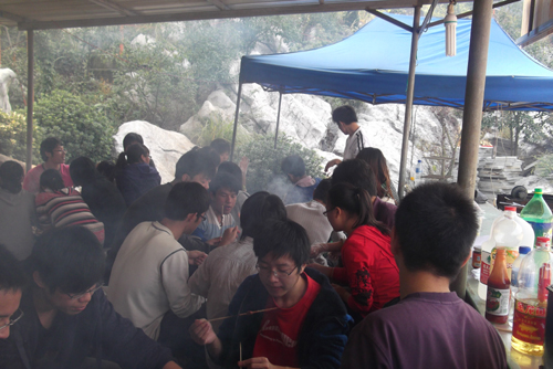 接下来,我们进行了旅程的第二项——烧烤。虽然地方没有前几次那么大,但这也正好让我们班围得更紧,吃得很欢,喝的更hign。我们烧烤了羊肉串,牛肉串,骨肉串,里脊肉,鸡翅,鱿鱼,玉米,番薯…… 到最后,每个人都拍拍肚子,大吼一声:“偶吃饱了!”