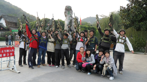 酒足饭饱之后,是本次旅游的压轴戏——CS。男生当然是天生喜欢打枪,女生照样是巾帼英雄,拿起枪杆向前冲。首先教练教我们基础的射击方式和上弹方法,再教我们以下基本规则,我们就奔赴战场了。我们班为一个战营,对战另一个战营。我们首先选出我们军训时的副排长为指挥官,指挥官发话了:“3到4人为一组一组配一个狙击枪,一个步枪,一个冲锋枪。”激战开始了,大家狂按手下的扳机,虽然使用的是激光枪,没有硝烟和光线,但战场上还是充斥着热血和激情,因为时不时战士们背上的装置就会发出一声惨叫,那此战士就阵亡了。经过一阵奋战后,我们最终落败,但我们不服啊,因为敌人有人作弊,用帽子挡住了激光接收器。当然我们进行了举报,呵呵呵,那几个人被教练踢出了战斗,我们高呼“理解万岁”。第二场战斗开始了,由于第一场的惨败,我们战士的斗志相当旺盛,我们一共发动3次突破2次偷袭,打的敌人措手不及,被我军全歼,而我军还剩下15人,只损失了一半,我军大获全胜。
