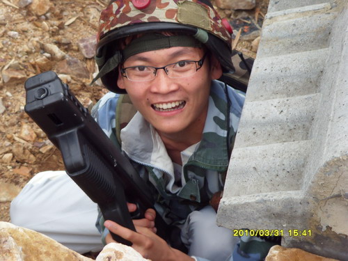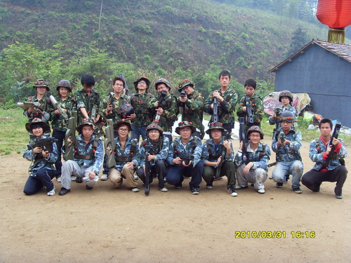 两个小时的车程后,我们到达了真人CS实战基地——桃源谷。下车后,基地的教练就出来迎接我们,给我们发军服和设备,讲解了设备如何使用和注意安全事项。我们既紧张,又兴奋。平常都是在游戏里打CS,现在终于有机会来个真人实战了,别提有多高兴!教练把我们分成两个小分队——警察队和土匪队,又讲了游戏规则后,警察跟土匪之间第一场阵地战开始了。土匪队司令带本队员先埋伏在阵地里,随着警报声GO、GO......,警察队司令带队逮捕土匪。可是警察队迟迟都没冲到阵地里去,土匪队就兵分两路主动突击,一路绕过警戒线从后方突围,一路正面与警方交战。土匪比较灵活善战,在枪声乱战中诈降混进了警方捣乱,还是抵挡不住警方的全力围剿,第一场警察队胜出,其中警方的狙击手第一名,而土匪帮的女狙击手并列第二。