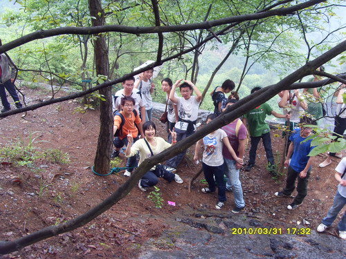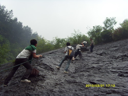 休息片刻,我们沿村落行走,小路绕山而设,路势陡峭而蜿蜒,略显得逼仄。在道途中跌荡,不见任何动态风物,不禁回头看,才觉已在半山腰;越往前爬察觉此山越发神秘。路将尽,见正前方有一崖,我们置身于悬崖底部,面对那高高竖立的岩壁和稀疏散落的凹凸,石壁上怪石嶙峋,崖底只有一条绳子,阴森得令人畏惧,我们等还来不及惊叹,便已有同学往上攀,不管男生女生,都惨状百出了,看到能睬的就睬,看到能抓的就抓,手脚并用,半天也上不去, “一点劲都使不出来```手发抖```脚发软```”这是上去了以后的感受。