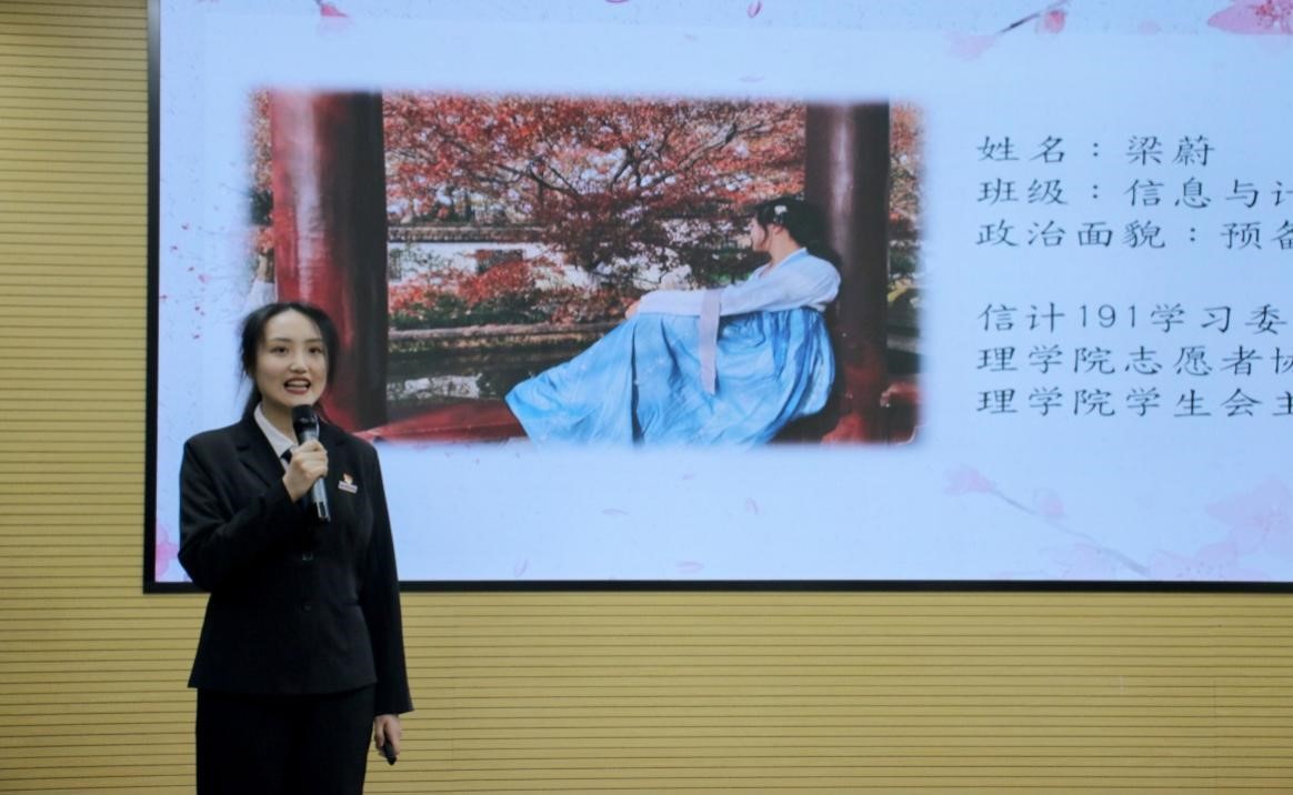 随后,璀璨之星们开始个人风采展示。信息与计算科学191班的班长陈奕翀从学习生活和班团工作出发,分享她的带领班级斩获各项荣誉的故事。数据科学与大数据技术(中法班)191班陆文婷创立了多项创新项目和发明专利,她讲述了她的科研成果和竞赛之旅。信息与计算科学191班梁蔚始终牢记党的教诲,用实际行动诠释了责任与担当,她分享了她与各类志愿活动、团学工作的故事。信息与计算科学191班史琦,她的思政微课发布在各大官方媒体上,且勇攀各科高峰,囊括学业、社会实践、团学工作、科技竞赛各类奖项。数据科学与大数据技术191班林欣颖,踏实学习,勤恳工作,获多项竞赛奖项,积极参与各种志愿活动,并通过BBIN