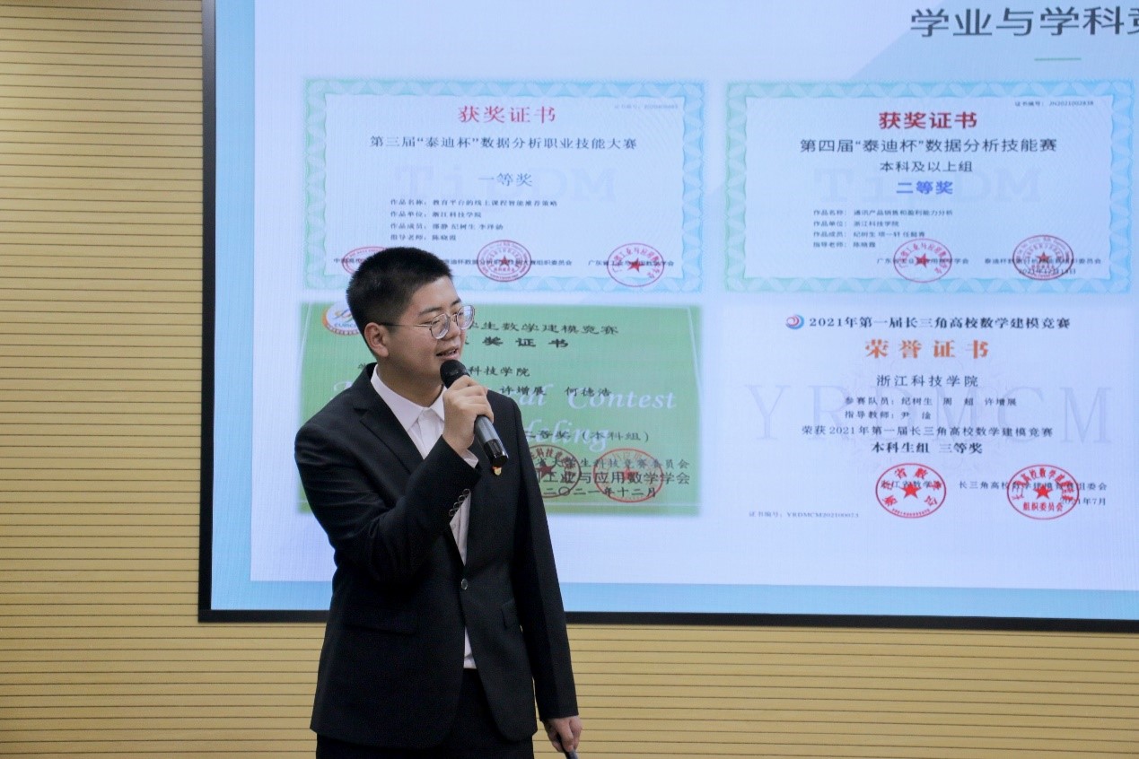 的宣传工作。数据科学与大数据技术(中法班)192班卢奕霖热爱舞蹈,获多项舞蹈奖项;勤奋学习,获奖学金,多种竞赛奖项等。数据科学与大数据技术191班纪树生担任班长、院团委组织委员、院学生会活动部负责人等多种职责,分享了他在学科竞赛道路上的成长之旅。应用物理191班研究生吴白瑞,发表多篇论文、拥有多项专利,他分享了他的科研道路。数据科学与大数据技术201班九折团队,拥有着“纸折九次,并非不可”勇于突破的探索精神,分享了他们获全国大学生数模竞赛一等奖的经验。数据科学与大数据技术192班汪安琪,凭借着自我管理和毅力,参与了多项体育赛事并获奖,特别是中国大学生皮划艇锦标赛冠军。