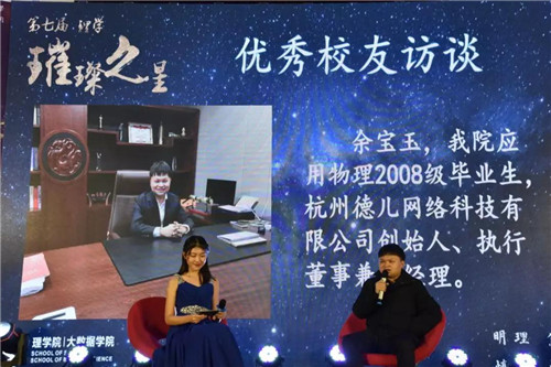 应用物理2008级校友,杭州德儿网络科技有限公司创始人、执行董事兼总经理余宝玉获杰出校友璀璨之星。他在访谈中回顾了自己的大学生活,叙述了个人创业经历,并建议大家要在大学期间广交朋友、学好专业知识。