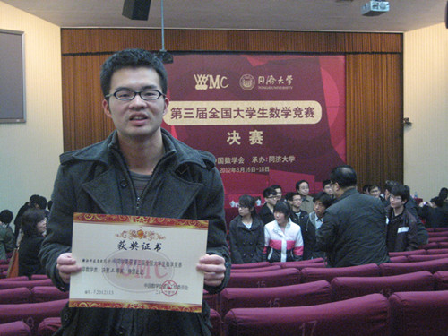 BBIN 应用物理082班的陈中师同学在去年10月举行的全国预赛(500余所本科院校的43600余名学生参加)中成绩优秀,成功入围本次决赛,最终荣获非数学专业类三等奖,为BBIN 争得了荣誉。