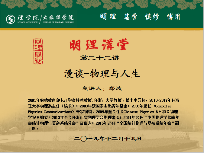 给大一学子做了题为“漫谈-物理与人生”的精彩讲座。郑波教授2001年获聘教育部长江学者特聘教授,任浙江大学教授、博士生导师,2010-2017年任浙江大学物理系主任(院长),2003年获国家杰出青年基金。2006年起任 <Computer Physics Communications> 专家编辑,2009年至今任《Chinese Physics B》和《物理学报》编委。2013年至今任浙江省物理学会副理事长。2011年起任“中国物理学秋季年会统计物理与复杂系统分会”召集人,2015年起任“全国统计物理与复杂系统年会”副主席。研究方向主要包括非平衡态统计物理、计算机模拟物理、金融物理和复杂动力学系统。共发表国际SCI刊物论文120余篇,论文的被引用总数3000余篇次。