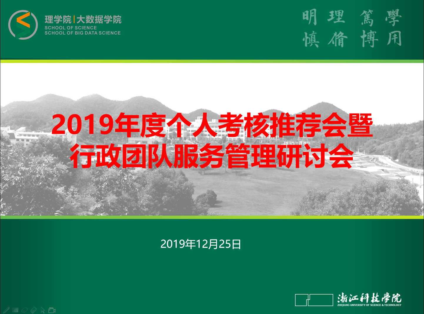 在A4-222会议室召开2019年度个人考核推荐会暨行政团队服务管理研讨会,校党委委员、院党委书记、院长陶祥兴,院党委副书记王宝明、副院长徐弼军以及全体行政人员参加本次会议,会议由办公室主任王铁军主持。