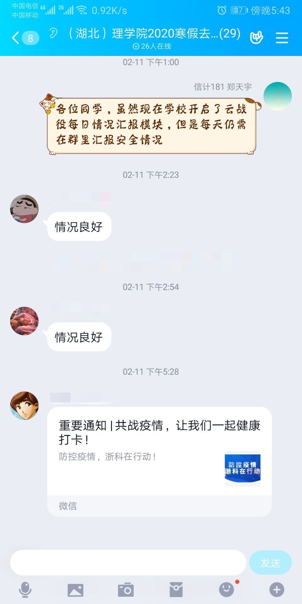 相关通知,督促同学完成每日健康打卡,确保各年级疫情预防做到实时监控,关心周围同学的健康及心理状况。