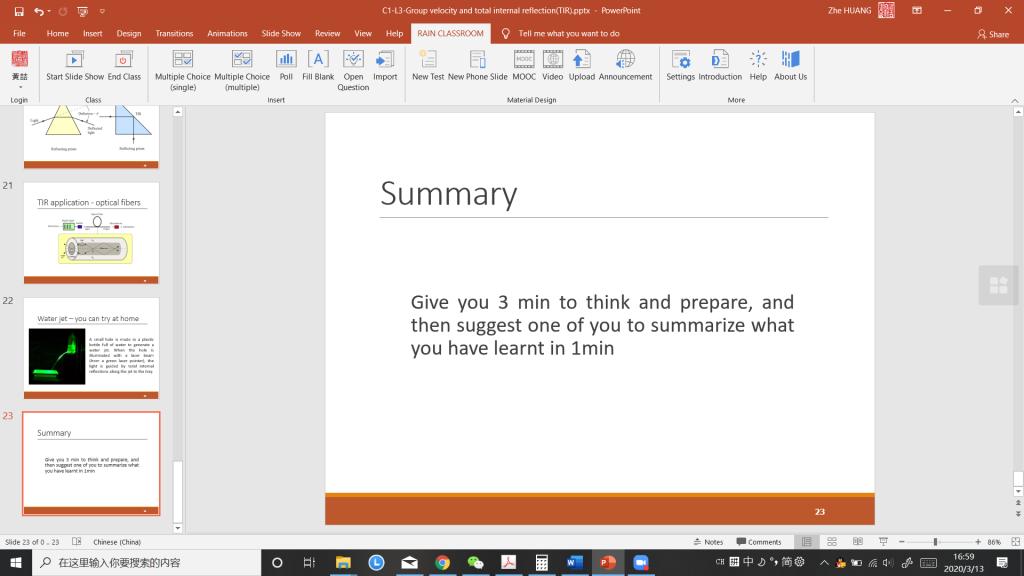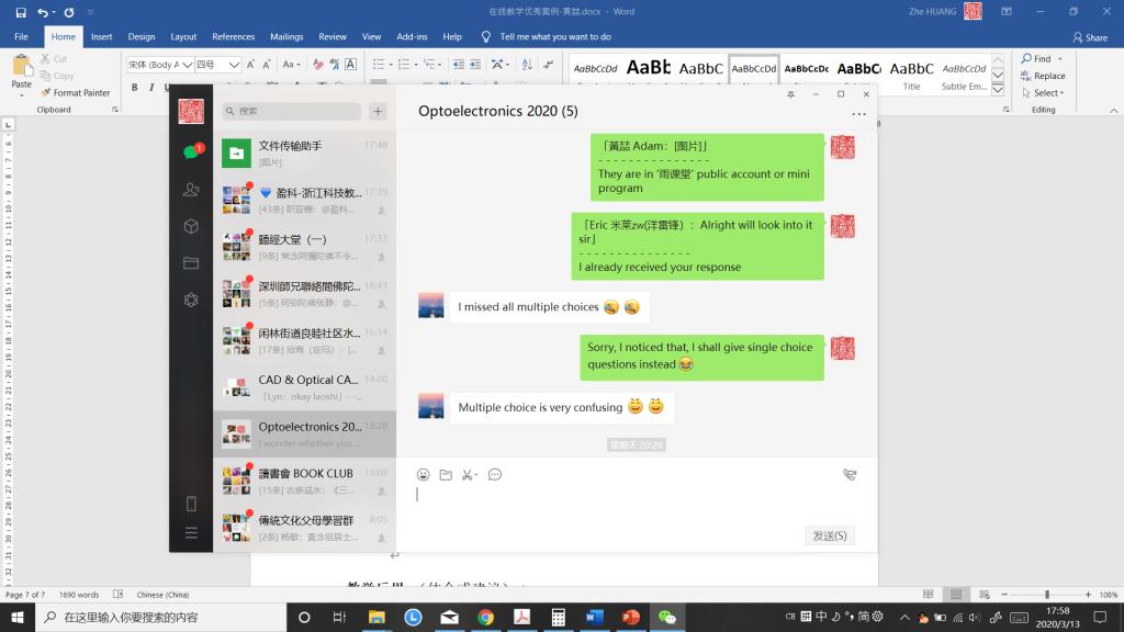 我自己的体会是上好一堂课,关心好不在一个地方尤其远在海外的学生很不容易。开始我在寒假初期花了很多时间学习和研究了“对分”教育理念和BOPPPS有效教学法理论,后期钻研各种线上教学的平台、技术工具(雨课堂、智慧树、中国大学生MOOC、QQ群视频/直播、zoom、钉钉直播/群视频、Blackboard等)。经过一周多的教学实践,感觉目前上课的技术比较熟练运用起来。但是逐渐在课堂和课下发现如何挖掘好学生的学习积极性和专注力的问题,需要我在以下方面进一步努力:进一步精简线上直播课堂内容和难度,注重线上、线下学生自学和引导学生间分享讨论全过程的教学。