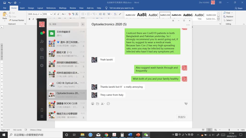 留学生对于目前的新冠肺炎世界流行是比较担心的,尤其是在海外的同学,他们比较心烦。所以我先安慰和提醒他们做好个人和家庭的防护工作。