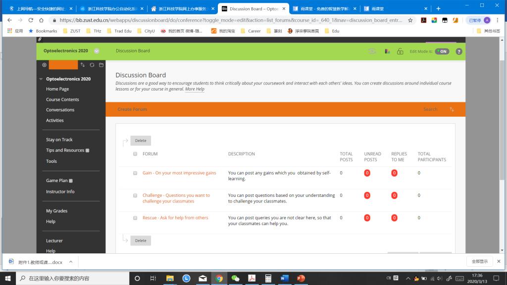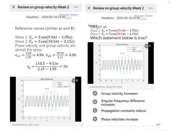 由于学生在线下自学时对某些比较难理解的概念可能(例如本课程开始的波阵面、群速度等)有疑问或者有学到新的内容,我参照“对分”教学中的“亮考帮”作业(“亮”:亮闪闪,学生通过自学明白的最大得意;“考”:学生自学时搞清楚的概念可以设置问题考考其他同学;“帮”:学生自学后不能解决的问题,需要其他同学帮忙),设置“亮考帮”三类讨论区论坛(‘Gain-Challenge-Rescue’Forums):