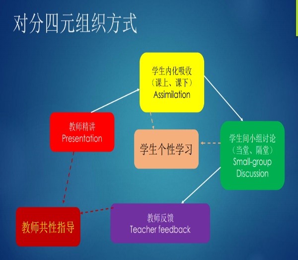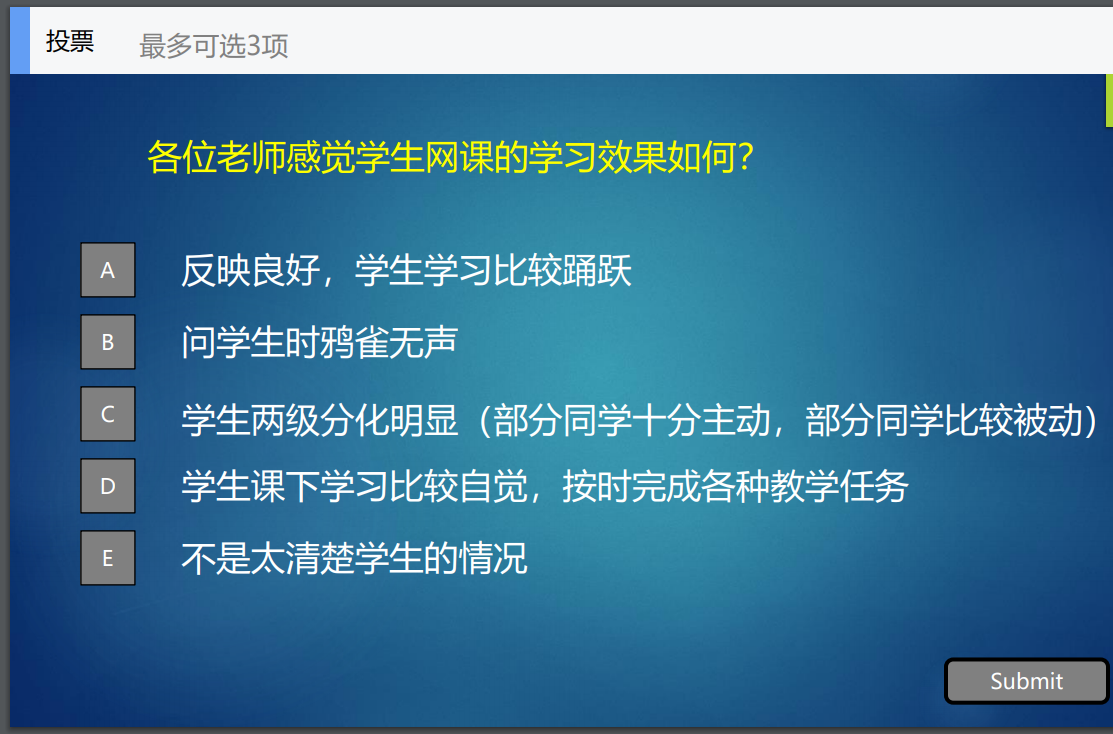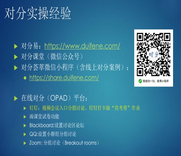 黄喆从“您个人对上网课适应吗?”“各位老师感觉学生网课的学习效果如何”等问题进行现场问卷投票,引出破解思路——对分教学理念;然后又以智慧教学工具“雨课堂”为例,分享了增添课堂色彩的经验;从“偏理论课、偏应用课程”进行课程案例分享;并现场钉钉平台进行了对分(小组讨论)体验。