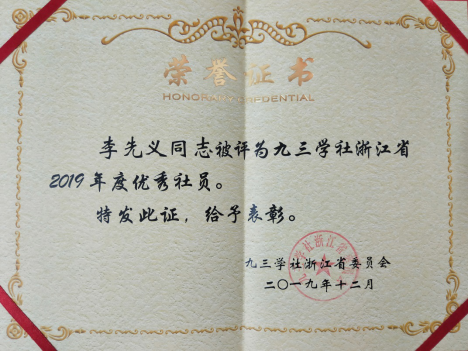 李先义教授始终以强烈的事业心和高度的责任感履行教师职责,不仅2019年在教学和科研工作中取得突出成绩,而且一直积极参加九三学社组织的各类活动,认真履职,为实现浙江省的“两个高水平”奋斗目标而不断献言献策。