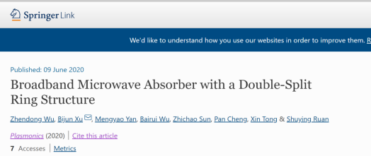 2017级应用物理学本科生吴震东同学在徐弼军老师指导下以第一作者身份在国际知名期刊《Plasmonics》(IF=2.926,中科院三区)发表了一篇高质量学术论文,报道了他们在超材料的吸收损耗特性最新研究成果。浙江科技BBIN