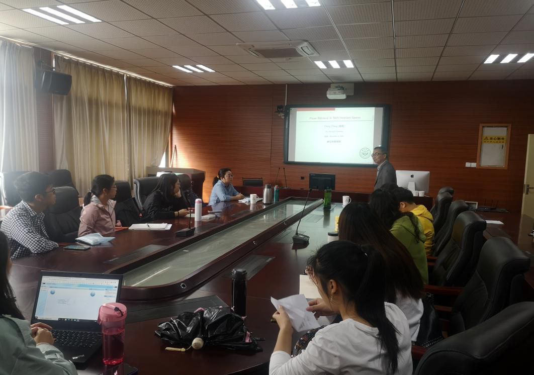 成诚指出,平移不变信号中的相位恢复是一个无穷维的相位恢复问题, 是应用调和分析领域中新兴的研究方向之一, 在工程和物理等学科中有广 泛应用。报告中,成诚老师指出不是所有的平移不变空间中实值信号都是可相位恢复的,进而引进了不可分信号的概念,并且刻画出可相位恢复的信号。报告内容新颖,丰富,与会师生,特别是研究生非常感兴趣,与成老师进行了热烈的互动。