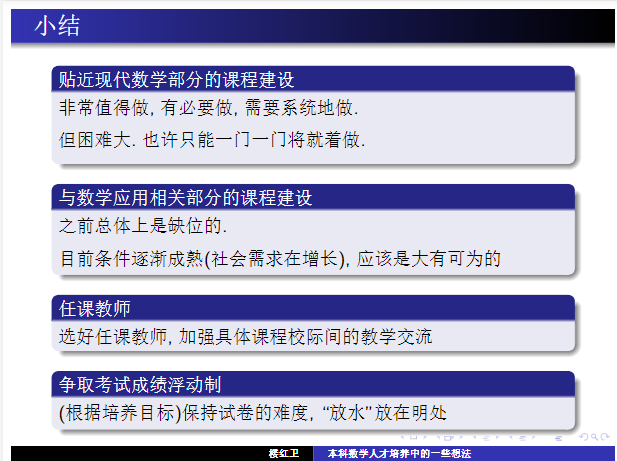 随后,楼教授和与会教师们讨论了目前数学教学方面的现状和建议,提倡“无学分讨论班”,认为这种教学方式灵活、有利于发挥教师专长,利于学生尽早接触数学应用,发现学术兴趣点,值得尝试!会上还讨论了“课程内容完整性”选择,认为应该不避开困难的内容,尽早讲完整、讲透,但是可以不作为考核要求!最后还就考试难度方面进行了分析,认为降低卷面难度不可取,会打击优秀学生积极性,同时使得目标第的学生进一步降低对自身的要求,恶性循环!那为了达到BBIN