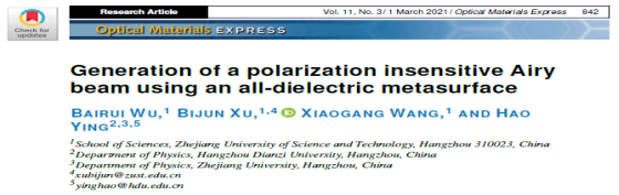 应用物理系2019级研究生吴白瑞同学在徐弼军指导下以第一作者身份在美国光学学会旗下的国际知名学术期刊《Optical Materials Express》(影响因子3.064,中科院二区)上发表一篇高质量学术论文,报道了他们在超构表面产生特殊光束的最新研究成果。浙江科技BBIN