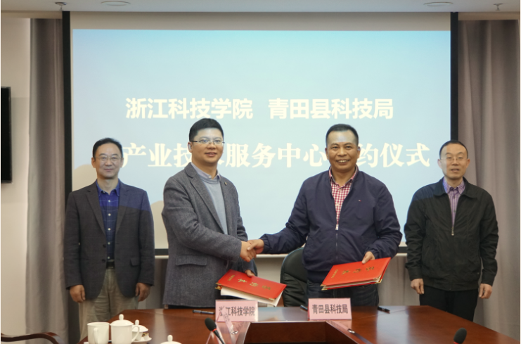 与青田县共建“青田县鞋产业技术服务中心”签约仪式在青田县科技局举行,副校长冯军、青田县科技局局长章旭阳、校科技处处长马伟峰、BBIN