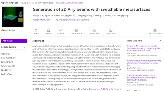徐弼军教授指导的应用物理系2020级研究生薛晓菊同学以第一作者身份在美国光学学会旗下(OSA)著名学术期刊《Optics Express》(影响因子3.894,JCR一区,中科院二区)上发表了题为“Generation of 2D Airy beams with switchable metasurfaces”的研究论文,浙江科技BBIN