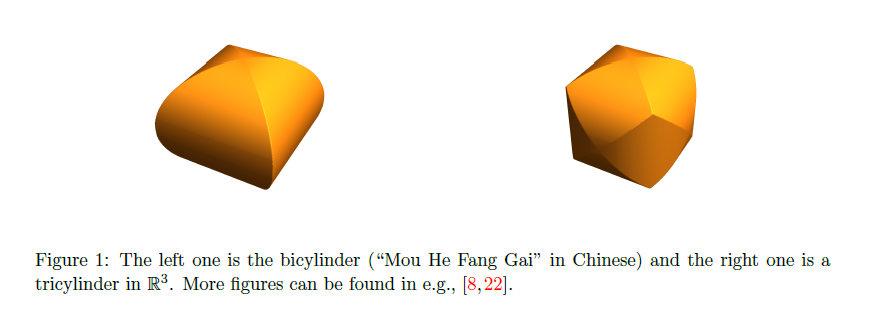 该论文首次定义正弦形式的极体,并建立了关于正弦极体的Blaschke- Santaló 不等式。事实上,正弦极体是一些圆柱的交,在数学界称为 Steinmetz 体,其中我们所熟知的牟合方盖(见图左一)就是一类特殊的Steinmetz 体,在西方最早的文献记录可以追溯到公元前二百多年的阿基米德,中国古代数学家刘徽,祖冲之和祖暅之在魏晋南北朝时期对此也有比较深入的研究。最有名的开创性结果就是祖冲之父子利用牟合方盖准确计算出3-维球体的体积,为中国数学发展历史增添了浓厚的一笔,如今牟合方盖的体积和表面积的计算经常出现在大学的数学教材上。李爱军教授与合作者阐述了如何利用现代的凸几何方法去研究牟合方盖,并由此引出一个全新的研究课题:由圆柱相交所生产成的凸体(圆柱包)及其性质,并建立了正弦形式的Lp Blaschke-Santaló 不等式 (p趋于无穷时,该不等式转化为关于正弦极体的Blaschke- Santaló 不等式),此结果是李爱军教授与合作者在2019年发表在《Advances in Mathematics》上的关于正弦椭球的Blaschke-Santaló 不等式(p=2)的推广。此外,通过Lp正弦 Blaschke-Santaló 不等式,他们还建立了信息论中的正弦 Lp 幂熵不等式。关于这方面正弦变换的结果完全平行于经典的关于余弦变换的相应结果,因此,该研究成果受到了审稿专家高度赞扬,认为这一工作是一个非常有价值的研究。