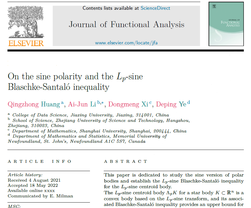 黄卿中博士、上海大学席东盟博士、加拿大纽芬兰纪念大学叶德平教授合作在国际权威数学期刊《Journal of Functional Analysis》上在线发表了题为“On the sine polarity and the Lp-sine Blaschke-Santaló inequality”的学术论文。