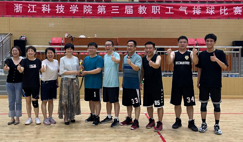 教工气排球队群策群力、及时调整战术,通过三局苦战,最终以18:21、23:21和15:13的比分捧起了本届比赛的冠军奖杯。