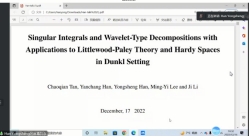 大会26场学术报告研讨和交流了调和分析与应用调和分析的最新研究成果和前沿进展,主要包括Dunkl算子、Yamabe型方程、极大函数、神经网络、相位恢复、先验信息信号与图像重构、Hardy空间小波刻画、Calderon交换子、拟微分算子加权估计等主题。BBIN