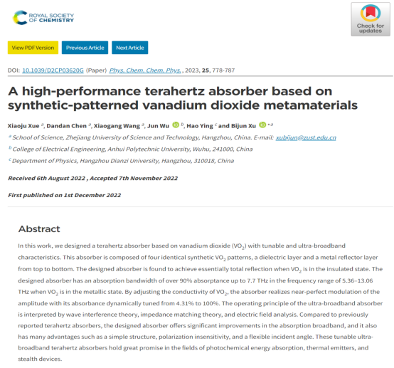 1、研究团队中2020级研究生薛晓菊以第一作者身份在《Physical Chemistry Chemical Physics (PCCP)》 期刊上发表了题为“High-performance terahertz absorber based on synthetic-patterned vanadium dioxide metamaterials”的创新研究文章。浙江科技BBIN
