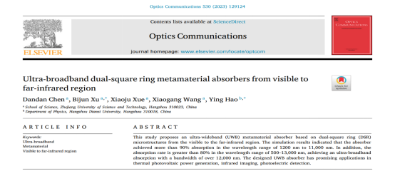 2、研究团队2021级研究生陈丹丹同学以第一作者身份在期刊《Optics Communications》上发表了题为“Ultra-broadband dual-square ring metamaterial absorbers from visible to far-infrared region”的研究论文。浙江科技BBIN