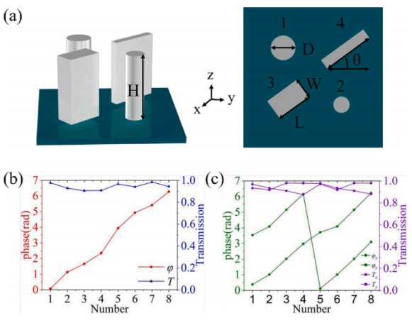 该论文提出了一种基于传播相位和几何相位组合的超表面全相位调制圆偏振光复振幅方法。作为证明,论文给出了设计的超表面在焦距相等时对LCP波和RCP波入射的聚焦和涡聚焦调制结果,以及在焦距不等时对LCP波和RCP波入射的聚焦调制结果,结果与理论吻合较好。通过这种设计方法,实现了超表面对光波复振幅调控,从而进一步提高光学器件的分辨率和工作效率,在全息成像、光子探测等领域具有广阔的应用前景。