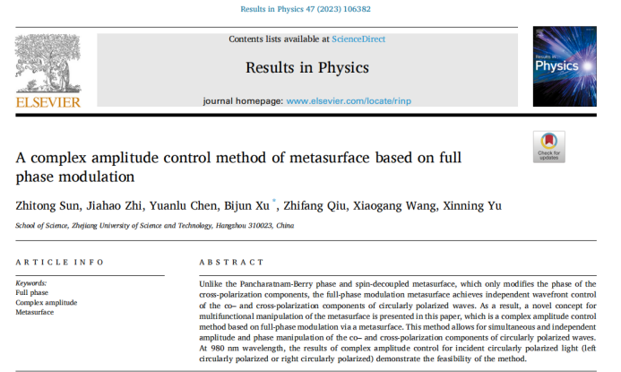 光子与光场调控及应用研究团队中2020级研究生孙志通以第一作者身份在《Results in physics》 期刊上发表了题为“A complex amplitude control method of metasurface based on full phase modulation”的创新研究文章。浙江科技BBIN