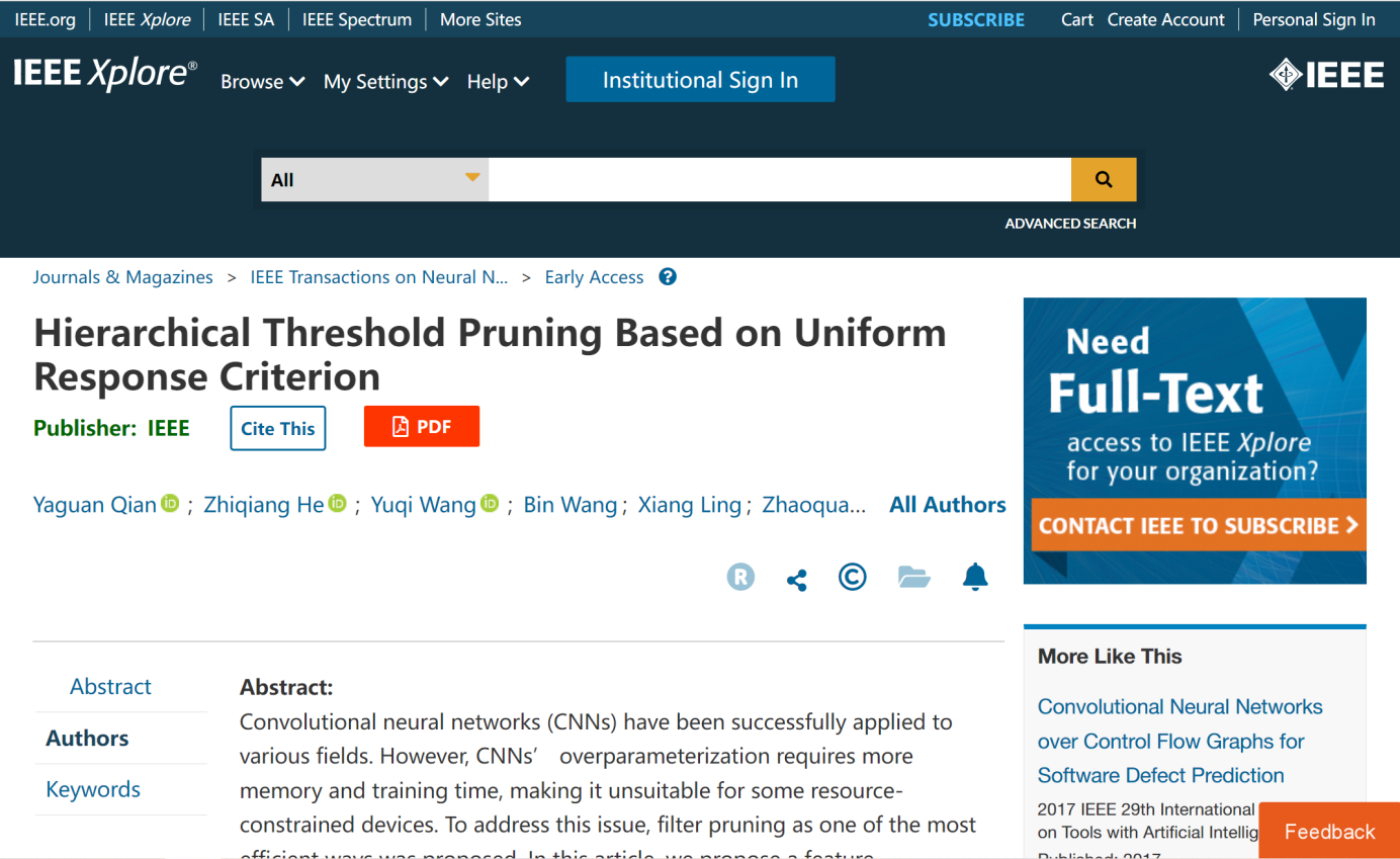 机器学习与数据科学团队(人工智能安全课题组)一篇论文《Hierarchical Threshold Pruning Based on Uniform Response Criterion》在人工智能领域顶级期刊IEEE Transactions on Neural Networks and Learning System上发表。IEEE TNNLS是人工智能领域的旗舰期刊,中科院一区,最新SCI影响因子为14.255。论文以BBIN