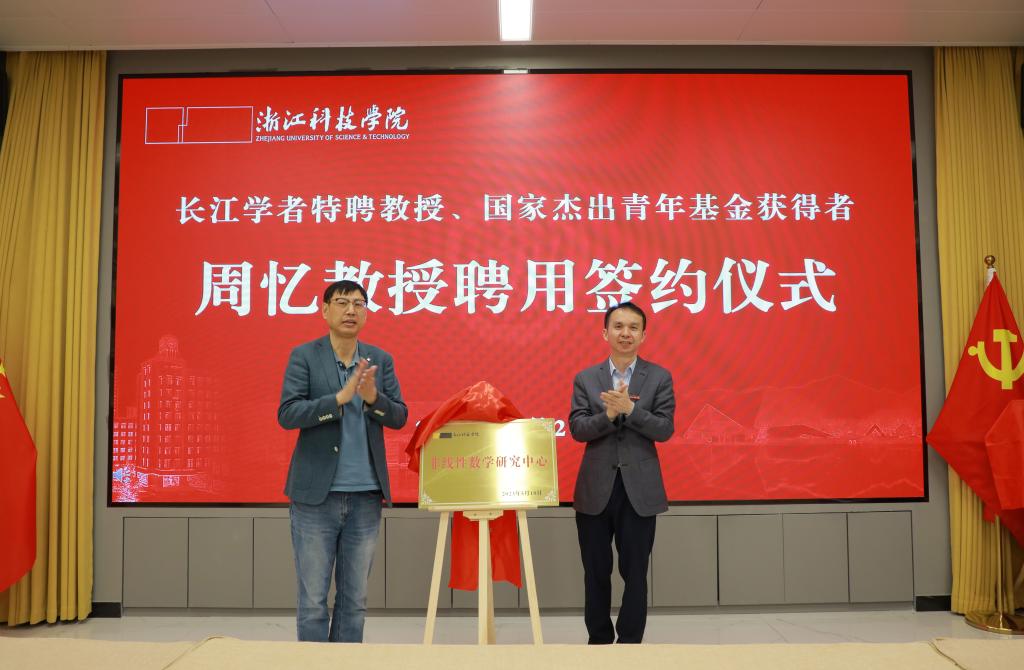 非线性数学研究中心”并聘请教育部长江学者、国家杰青获得者周忆教授担任中心主任的决定。随后,陈建孟校长和周忆教授共同为“非线性数学研究中心”揭牌。