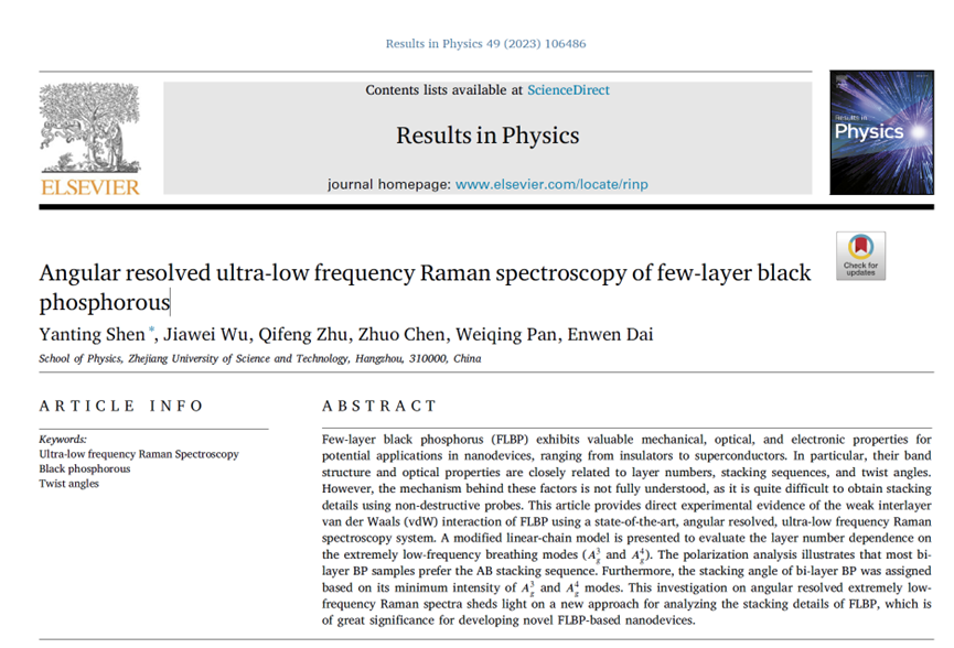 为第一单位在国际期刊Results in Physics(影响因子4.565,中科院SCI二区,JCR Q1)发表了题为“Angular resolved ultra-low frequency Raman spectroscopy of few-layer black phosphorous”的论文(链接://doi.org/10.1016/j.rinp.2023.106486)。青年教师沈艳婷为该论文的第一作者,研究生吴家伟为第二作者,潘卫清教授和戴恩文研究员为共同作者。该研究得到了国家自然科学基金、浙江省自然科学基金、浙江科技BBIN