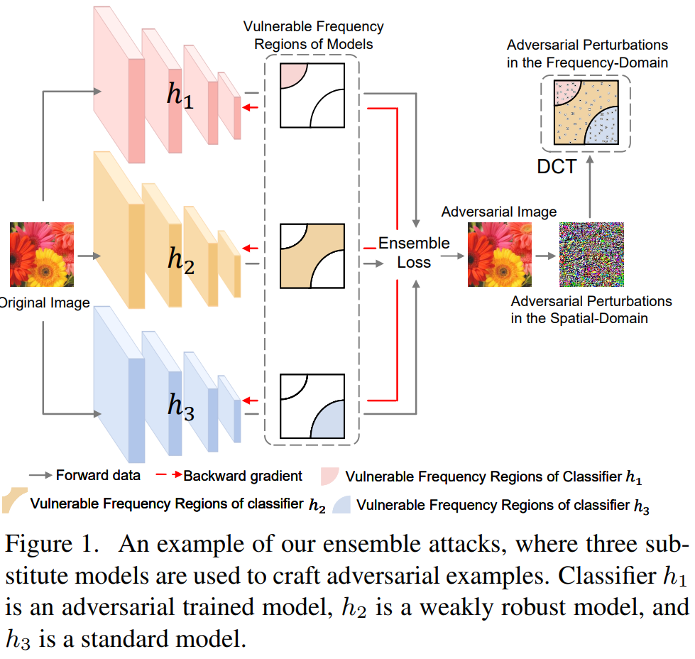 为第一单位,钱亚冠老师为第一作者,研究生贺姝可为第二作者。合作单位有海康威视、北京交通大学。论文针对目前深度神经网络在图像分类中的安全脆弱性这一研究热点,从研究的角度提出了一种新的轻量级集成攻击方法。论文首先发现了标准模型、弱鲁棒模型和鲁棒模型在频域的不同特性;基于该发现,通过离散余弦变换,从频域空间出发,构建不重叠的鲁棒脆弱区域;再通过不同鲁棒脆弱区域上的源模型集成,生成具有覆盖目标模型对抗子空间的对抗样本。该方法的优势在于用标准、弱鲁棒和鲁棒这三类模型集成,即可获得以往工作中需要大量源模型才能覆盖的对抗子空间,极大地提高了算法的时间效率,同时也提升了跨模型的黑箱攻击能力,对于产学界进一步认识人工智能模型的潜在安全风险具有积极意义。论文工作得到了国家自然科学基金重点项目、浙江省自然科学基金重点项目、(海康威视)多维感知技术应用与安全省重点实验室开放基金的资助。
