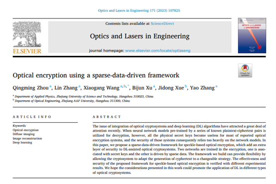 团队在深度学习应用于光学信息安全的研究方面,相关研究成果以论文形式发表在国际光学领域知名期刊Optics and Lasers in Engineering上(期刊影响因子4.6,中科院SCI二区,JCR Q1)。该论文题为“Optical encryption using a sparse-data-driven framework”。物理系2021级研究生周清明为本文的第一作者,汪小刚教授和徐弼军教授分别为通讯作者和共同指导老师,浙江科技BBIN