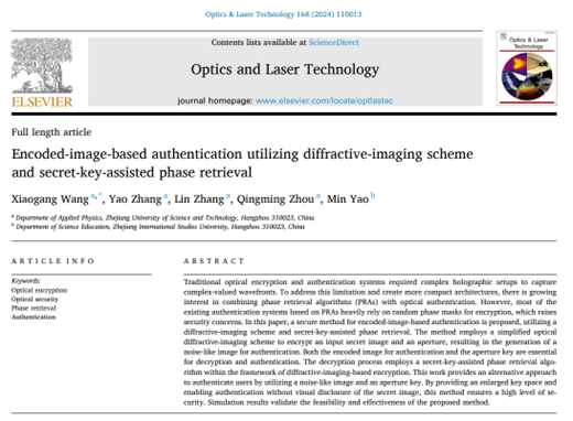 院光子与光场调控研究团队在“光学信息加密与认证”研究方面取得重要进展,相关研究成果以论文形式发表在国际光学领域知名期刊Optics & Laser Technology上(期刊影响因子5.0,中科院SCI二区,JCR Q1)。论文题为“Encoded-image-based authentication utilizing diffractive-imaging scheme and secret-key-assisted phase retrieval”。汪小刚教授为第一作者和通讯作者,浙江科技BBIN