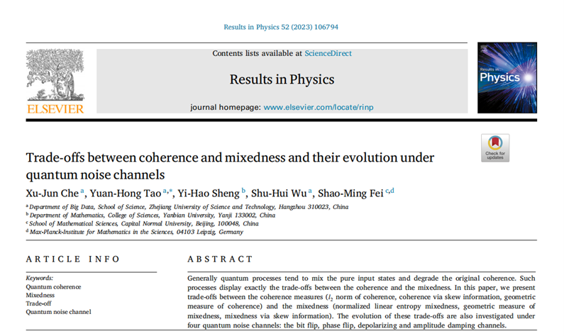 中法大数据2020级本科生车徐骏以第一作者身份在《Results in physics》期刊上发表了题为“Trade-offs between coherence and mixedness and their evolution under quantum noise channels”的科研文章。《Results in physics》是ELSEVIER旗下中科院分区SCI二区期刊。浙江科技BBIN