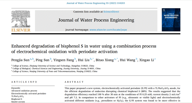 近日,应用物理系量子关联物质研究团队在“电催化新型氧化剂高碘酸盐降解污染物”研究中取得重要进展,研究成果以论文形式发表在国际期刊《Journal of Water Process Engineering》上(IF: 7.0,中科院二区),论文题目为“Enhanced degradation of bisphenol S in water using a combination process of electrochemical oxidation with periodate activation”。物理学专业21级硕士研究生孙鹏佳为该论文的第一作者,熊必涛副教授为该论文的通讯作者,浙江科技BBIN