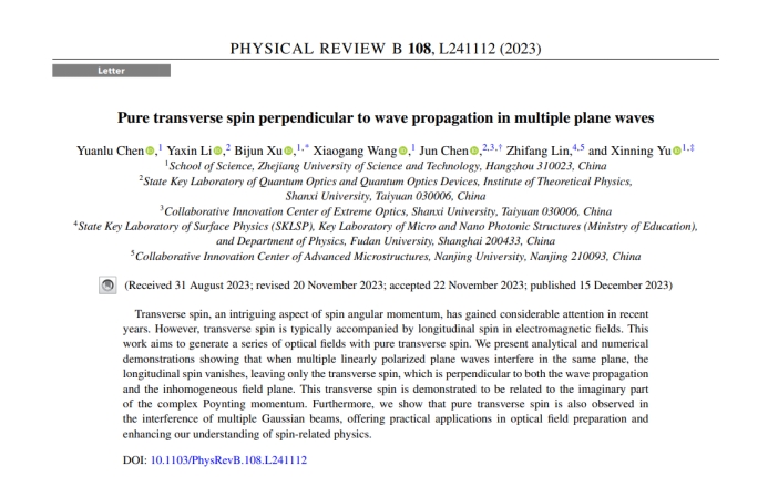 光子与光场调控研究团队中2021级研究生陈远路以第一作者身份在《Physical Review B》期刊上发表了题为“Pure transverse spin perpendicular to wave propagation in multiple plane waves”的创新研究文章。BBIN